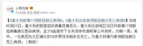 当地时间21日,意大利的新型冠状病毒疫情恶化。意大利北部地区当日共新增17例新冠病毒肺炎感染病例,至少9座城市下令关闭学校酒吧等公共场所,为期一周。其中,一位威尼托大区确诊的78岁男性在帕多瓦死亡,为意大利境内首例新冠肺炎死亡病例。(韩硕)