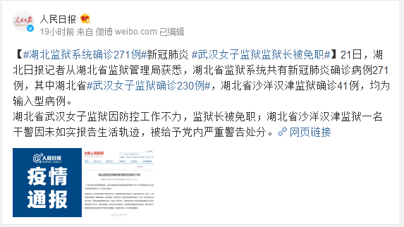 21日,湖北日报记者从湖北省监狱管理局获悉,湖北省监狱系统共有新冠肺炎确诊病例271例,其中湖北省#武汉女子监狱确诊230例#,湖北省沙洋汉津监狱确诊41例,均为输入型病例。