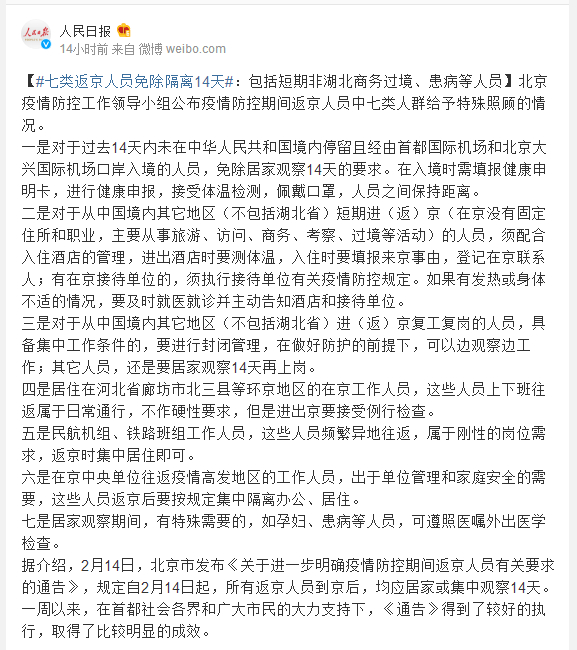 北京疫情防控工作领导小组公布疫情防控期间返京人员中七类人群给予特殊照顾的情况。