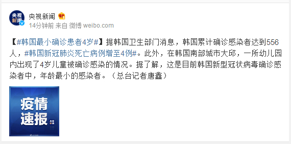 据韩国卫生部门消息,韩国累计确诊感染者达到556人,#韩国新冠肺炎死亡病例增至4例#。此外,在韩国南部城市大邱,一所幼儿园内出现了4岁儿童被确诊感染的情况。据了解,这是目前韩国新型冠状病毒确诊感染者中,年龄最小的感染者。(总台记者唐鑫)