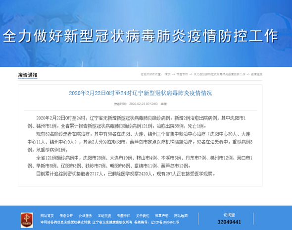 2020年2月22日0时至24时,辽宁省无新增新型冠状病毒肺炎确诊病例。新增2例治愈出院病例,其中沈阳市1例、锦州市1例。全省累计报告新型冠状病毒肺炎确诊病例121例,治愈出院68例,死亡1例。