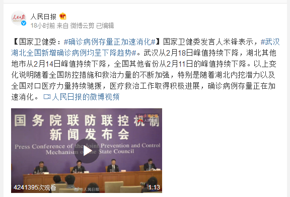 国家卫健委发言人米锋表示,#武汉湖北全国新增确诊病例均呈下降趋势#。武汉从2月18日峰值持续下降,湖北其他地市从2月14日峰值持续下降,全国其他省份从2月11日的峰值持续下降。以上变化说明随着全国防控措施和救治力量的不断加强,特别是随着湖北内挖潜力以及全国对口医疗力量持续驰援,医疗救治工作取得积极进展,确诊病例存量正在加速消化。