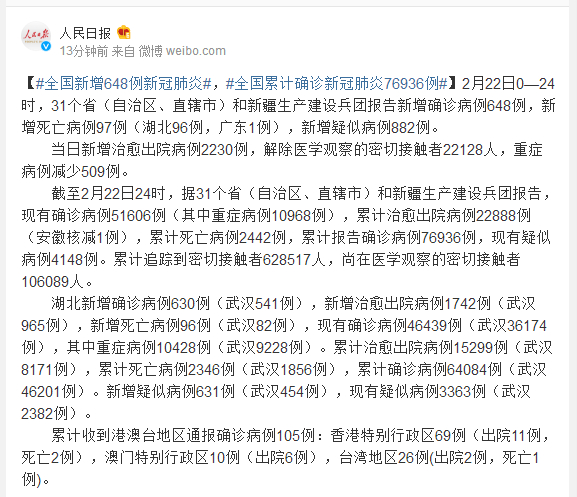 2月22日0—24时,31个省(自治区、直辖市)和新疆生产建设兵团报告新增确诊病例648例,新增死亡病例97例(湖北96例,广东1例),新增疑似病例882例。