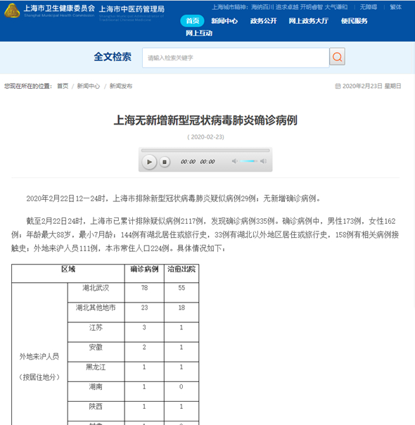 截至2月22日24时,上海市已累计排除疑似病例2117例,发现确诊病例335例。确诊病例中,男性173例,女性162例;年龄最大88岁,最小7月龄;144例有湖北居住或旅行史,33例有湖北以外地区居住或旅行史,158例有相关病例接触史;外地来沪人员111例,本市常住人口224例。具体情况如下: