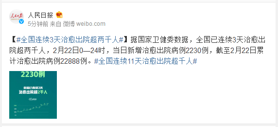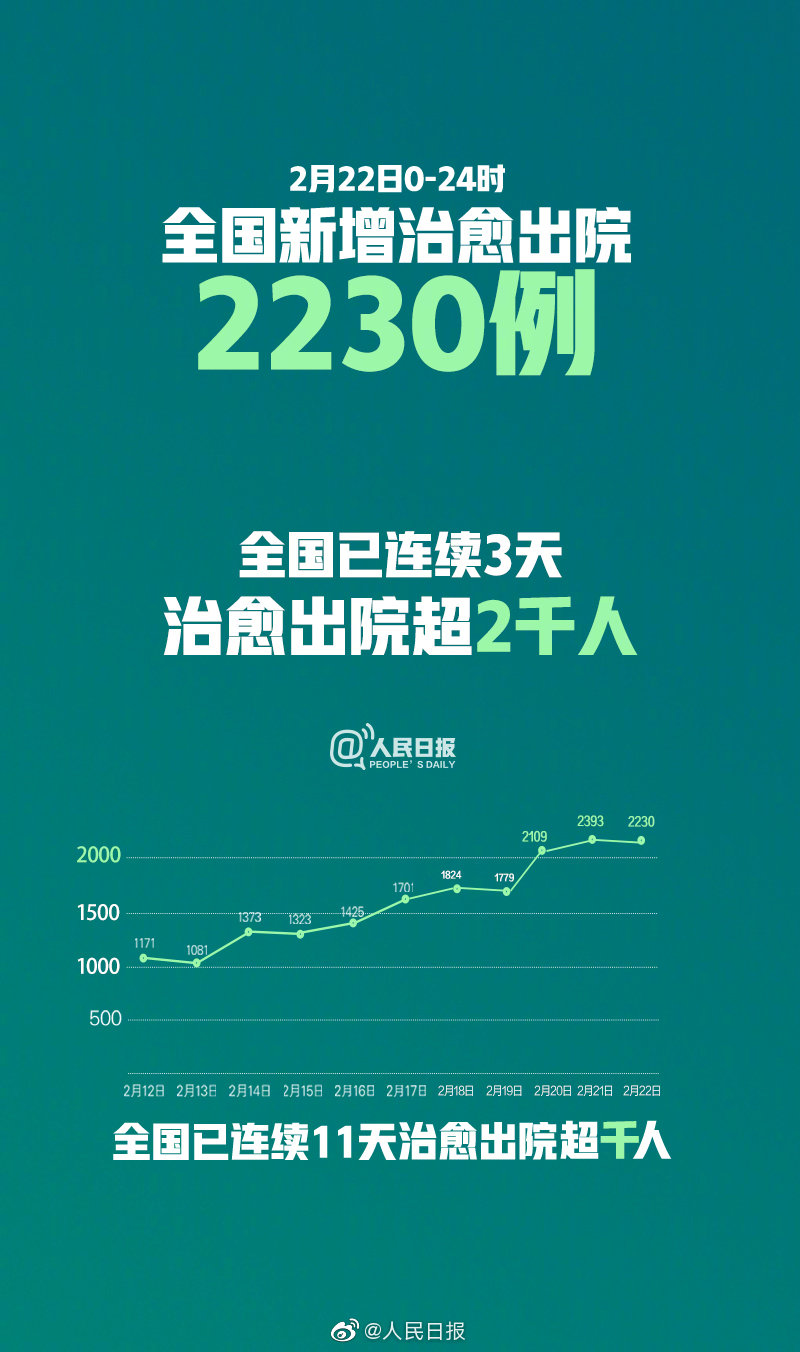 据国家卫健委数据,全国已连续3天治愈出院超两千人,2月22日0—24时,当日新增治愈出院病例2230例,截至2月22日累计治愈出院病例22888例。
