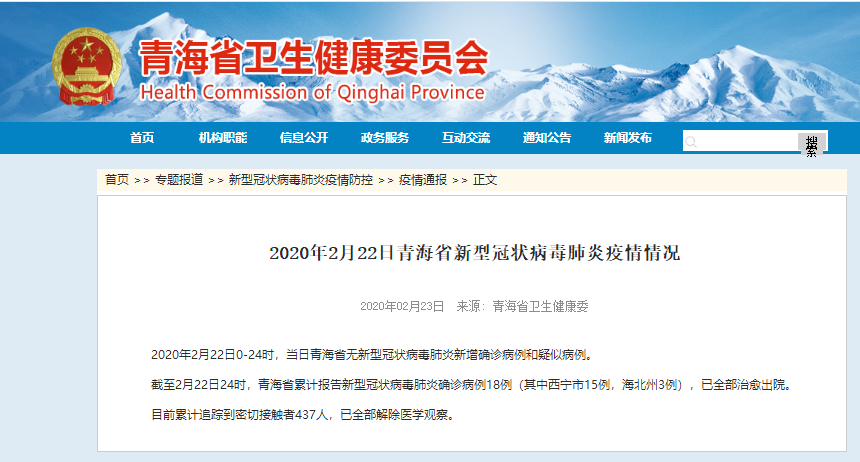 截至2月22日24时,青海省累计报告新型冠状病毒肺炎确诊病例18例(其中西宁市15例,海北州3例),已全部治愈出院。