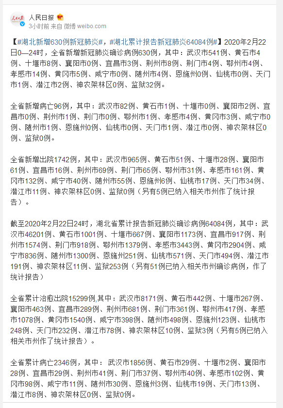 截至2020年2月22日24时,湖北省累计报告新冠肺炎确诊病例64084例,其中:武汉市46201例、黄石市1001例、十堰市667例、襄阳市1173例、宜昌市917例、荆州市1574例、荆门市918例、鄂州市1379例、孝感市3443例、黄冈市2904例、咸宁市836例、随州市1300例、恩施州251例、仙桃市571例、天门市494例、潜江市191例、神农架林区11例、监狱253例(另有51例已纳入相关市州确诊病例,作了统计报告)