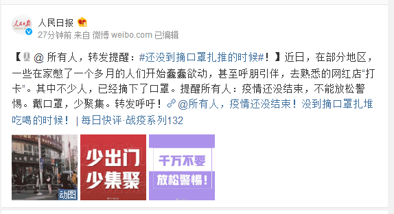 近日,在部分地区,一些在家憋了一个多月的人们开始蠢蠢欲动,甚至呼朋引伴,去熟悉的网红店“打卡”。其中不少人,已经摘下了口罩。提醒所有人:疫情还没结束,不能放松警惕。戴口罩,少聚集。转发呼吁!