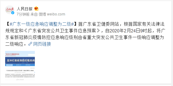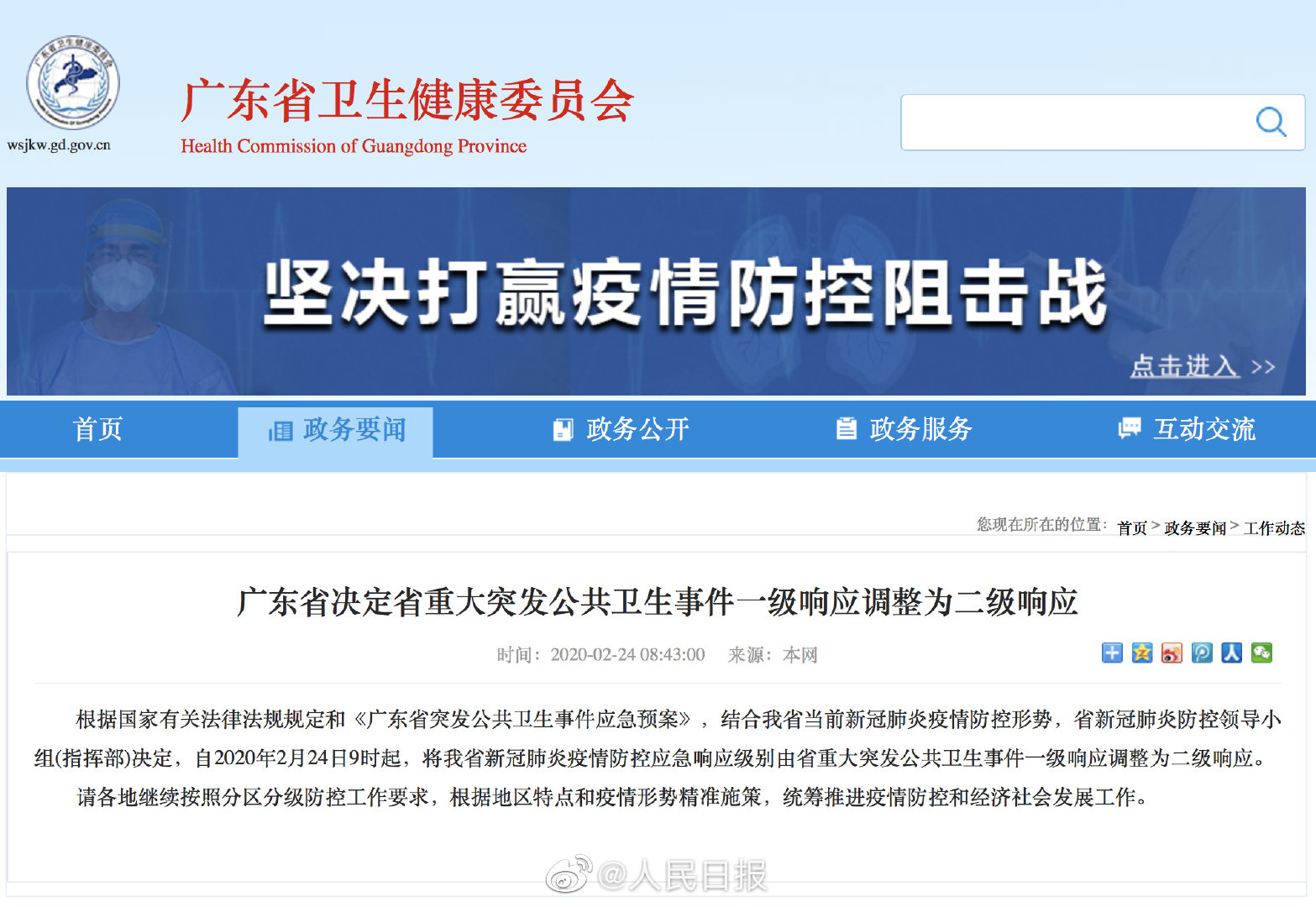据广东省卫健委网站,根据国家有关法律法规规定和《广东省突发公共卫生事件应急预案》,自2020年2月24日9时起,将广东省新冠肺炎疫情防控应急响应级别由省重大突发公共卫生事件一级响应调整为二级响应。