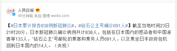 截至当地时间23日21时20分,日本新冠肺炎确诊病例共计838人,包括在日本国内的感染者和中国游客等133人,“钻石公主”号邮轮的乘客和乘务人员691人,以及乘坐日本政府包机回到日本国内的14人。(央视)
