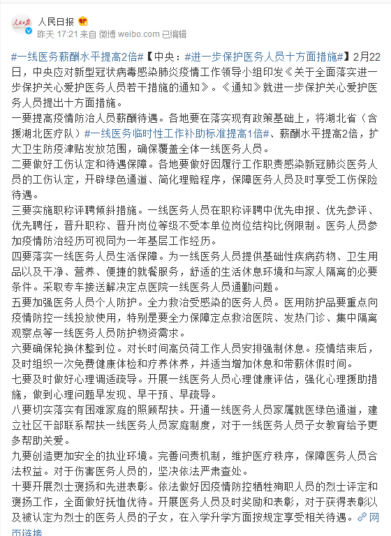 2月22日,中央应对新型冠状病毒感染肺炎疫情工作领导小组印发《关于全面落实进一步保护关心爱护医务人员若干措施的通知》。《通知》就进一步保护关心爱护医务人员提出十方面措施。