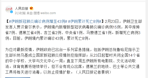 为应对最新疫情,伊朗政府已出台一系列紧急措施,包括伊朗总统鲁哈尼指示卫生部长纳马基成立国家新冠肺炎疫情防控指挥部;从23日起暂时关闭全国14个省的中小学校、大学与文化中心一周;直至下周五伊朗所有电影院、文化活动取消。体育竞赛将继续举行,但不会有观众出席;德黑兰的地铁、巴士等公共交通工具将每天进行消毒,以防止疫情扩散。(人民日报记者景玥)