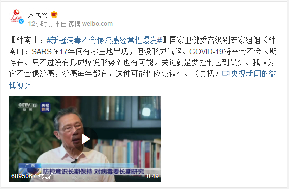 国家卫健委高级别专家组组长钟南山:SARS在17年间有零星地出现,但没形成气候。COVID-19将来会不会长期存在、只不过没有形成爆发形势?也有可能。关键就是要控制它到最少。我认为它不会像流感,流感每年都有,这种可能性应该较小。(央视)