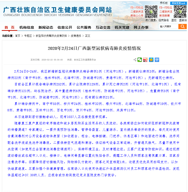 目前全区累计报告确诊病例252例,累计出院病例129例,累计死亡病例2例(河池市1例、北海市1例),现有确诊病例121例,均在院治疗,其中重症病例6例(桂林市1例、防城港市2例、河池市3例),危重病例5例(南宁市1例、北海市1例、防城港市2例、河池市1例);现有疑似病例21例。