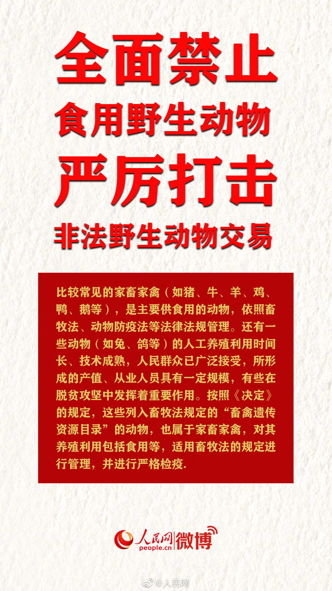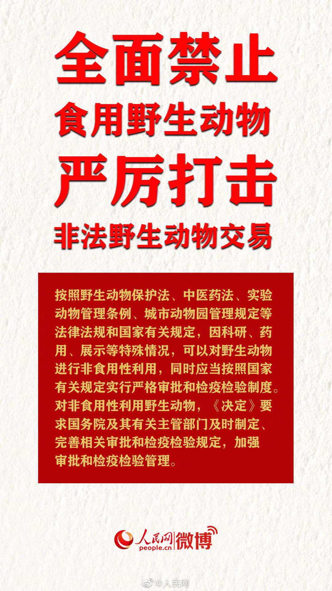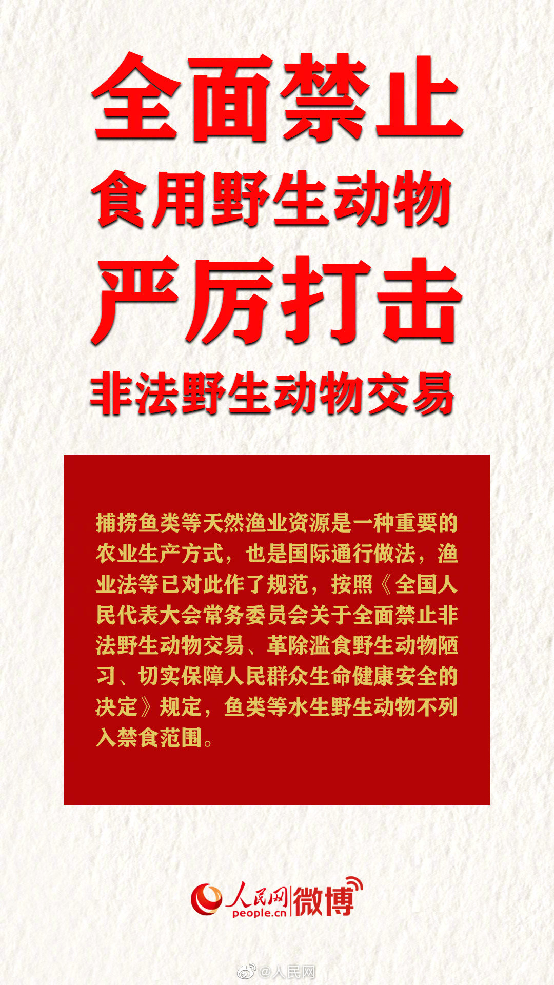 24日,全国人大常委会法工委经济法室副主任杨合庆答记者问时表示,正确理解全面禁食野生动物,需要把握好:①捕捞鱼类等天然渔业资源是一种重要的农业生产方式,渔业法等已对此作了规范,#鱼类等水生野生动物不列入禁食范围#;②列入畜牧法规定的“畜禽遗传资源目录”的动物,也属于家畜家禽,适用畜牧法的规定进行管理,并进行严格检疫;③因科研、药用、展示等特殊情况,可以对野生动物进行非食用性利用,同时应当按照国家有关规定实行严格审批和检疫检验制度。(人民日报)