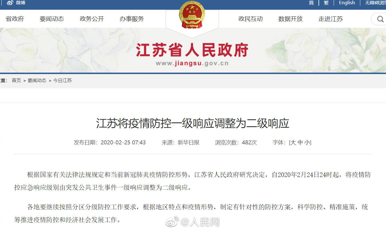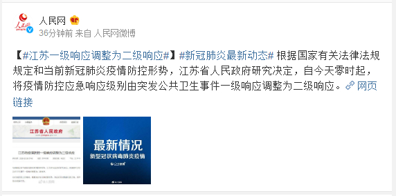 #新冠肺炎最新动态# 根据国家有关法律法规规定和当前新冠肺炎疫情防控形势,江苏省人民政府研究决定,自今天零时起,将疫情防控应急响应级别由突发公共卫生事件一级响应调整为二级响应。