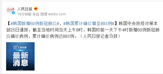 韩国中央防疫对策本部25日通报,截至当地时间当天上午9时,韩国较前一天下午4时新增60例新冠肺炎确诊病例,累计确诊病例达893例。(人民日报记者马菲)