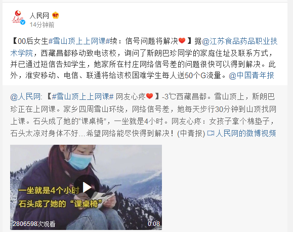 据@江苏食品药品职业技术学院,西藏昌都移动致电该校,询问了斯朗巴珍同学的家庭住址及联系方式,并已通过短信告知学生,她家所在村庄网络信号差的问题很快可以得到解决。此外,淮安移动、电信、联通将给该校困难学生每人送50个G流量。