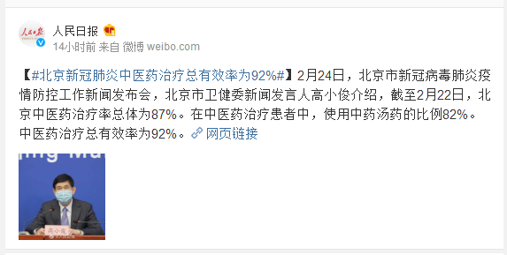 2月24日,北京市新冠病毒肺炎疫情防控工作新闻发布会,北京市卫健委新闻发言人高小俊介绍,截至2月22日,北京中医药治疗率总体为87%。在中医药治疗患者中,使用中药汤药的比例82%。中医药治疗总有效率为92%。