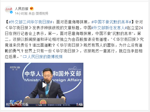 针对《华尔街日报》发表涉种族歧视的文章标题,中国#外交部新任发言人#赵立坚24日在例行记者会上表示,第一,面对恶意侮辱抹黑,中国不做“沉默的羔羊”。第二,该报以新闻报道和评论相对独立为由百般推诿没有道理。“《华尔街日报》究竟谁来负责任?谁出面道歉?《华尔街日报》既然有骂人的嚣张,为什么没有道歉的勇气?世界上只有一份《华尔街日报》,该报既然一意孤行,就应当承担相应后果。”