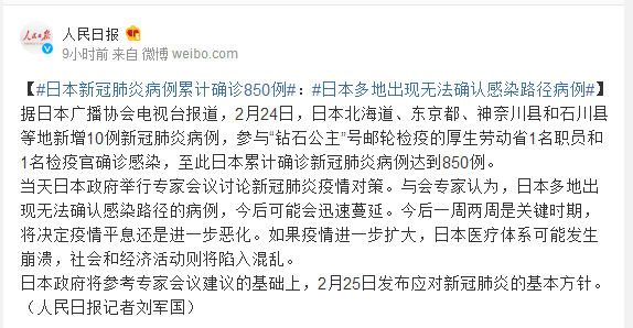 【#日本新冠肺炎病例累计确诊850例#:#日本多地出现无法确认感染路径病例#】据日本广播协会电视台报道,2月24日,日本北海道、东京都、神奈川县和石川县等地新增10例新冠肺炎病例,参与“钻石公主”号邮轮检疫的厚生劳动省1名职员和1名检疫官确诊感染,至此日本累计确诊新冠肺炎病例达到850例。