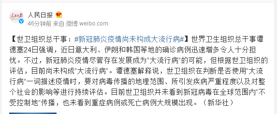 ¡¡¡¡ÊÀ½çÎÀÉú×éÖ¯×ܸÉÊÂÌ·µÂÈû24ÈÕÇ¿µ÷£¬½üÈÕÒâ´óÀû¡¢ÒÁÀʺͺ«¹úµÈµØµÄÈ·ÕﲡÀýѸËÙÔö¶àÁîÈËÊ®·Öµ£ÓÇ¡£²»¹ý£¬Ð¹ڷÎÑ×ÒßÇ龡¹Ü´æÔÚ·¢Õ¹³ÉΪ“´óÁ÷Ðв¡”µÄ¿ÉÄÜ£¬µ«¸ù¾ÝÊÀÎÀ×éÖ¯µÄÆÀ¹À£¬Ä¿Ç°ÉÐδ¹¹³É“´óÁ÷Ðв¡”¡£Ì·µÂÈû½âÊÍ˵£¬ÊÀÎÀ×éÖ¯ÔÚÅжÏÊÇ·ñʹÓÓ´óÁ÷Ðв¡”Ò»´ÊÃèÊöÒßÇéʱ£¬Òª¶Ô²¡¶¾´«²¥µÄµØÀí·¶Î§¡¢ËùÒý·¢¼²²¡ÑÏÖØ³Ì¶ÈÒÔ¼°¶ÔÕû¸öÉç»áµÄÓ°ÏìµÈ½øÐгÖÐøÆÀ¹À¡£Ä¿Ç°ÊÀÎÀ×éÖ¯²¢Î´¿´µ½Ð¹ڲ¡¶¾ÔÚÈ«Çò·¶Î§ÄÚ“²»ÊÜ¿ØÖƵؔ´«²¥£¬Ò²Î´¿´µ½ÖØÖ¢²¡Àý»òËÀÍö²¡Àý´ó¹æÄ£³öÏÖ¡£(лªÉç)