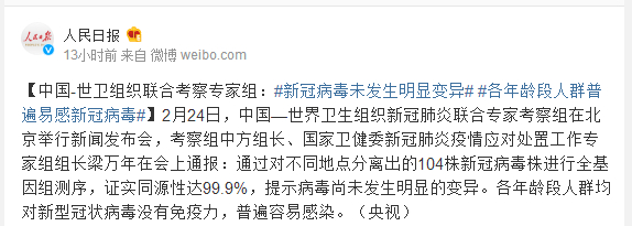 2月24日,中国—世界卫生组织新冠肺炎联合专家考察组在北京举行新闻发布会,考察组中方组长、国家卫健委新冠肺炎疫情应对处置工作专家组组长梁万年在会上通报:通过对不同地点分离出的104株新冠病毒株进行全基因组测序,证实同源性达99.9%,提示病毒尚未发生明显的变异。各年龄段人群均对新型冠状病毒没有免疫力,普遍容易感染。(央视)