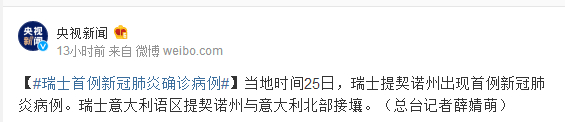 当地时间25日,瑞士提契诺州出现首例新冠肺炎病例。瑞士意大利语区提契诺州与意大利北部接壤。(总台记者薛婧萌)