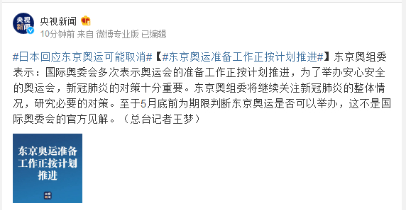 东京奥组委表示:国际奥委会多次表示奥运会的准备工作正按计划推进,为了举办安心安全的奥运会,新冠肺炎的对策十分重要。东京奥组委将继续关注新冠肺炎的整体情况,研究必要的对策。至于5月底前为期限判断东京奥运是否可以举办,这不是国际奥委会的官方见解。(总台记者王梦)