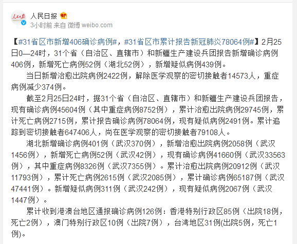 2月25日0—24时,31个省(自治区、直辖市)和新疆生产建设兵团报告新增确诊病例406例,新增死亡病例52例(湖北52例),新增疑似病例439例。