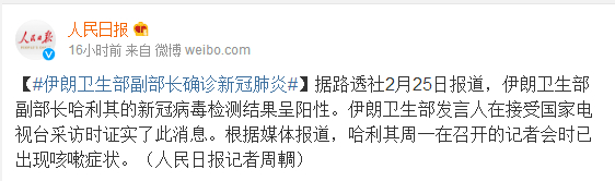 据路透社2月25日报道,伊朗卫生部副部长哈利其的新冠病毒检测结果呈阳性。伊朗卫生部发言人在接受国家电视台采访时证实了此消息。根据媒体报道,哈利其周一在召开的记者会时已出现咳嗽症状。(人民日报记者周輖)