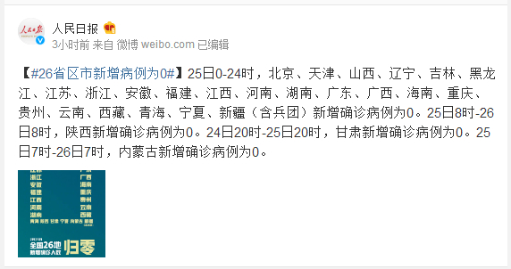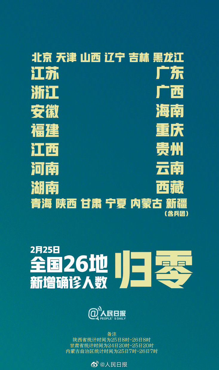 25日0-24时,北京、天津、山西、辽宁、吉林、黑龙江、江苏、浙江、安徽、福建、江西、河南、湖南、广东、广西、海南、重庆、贵州、云南、西藏、青海、宁夏、新疆(含兵团)新增确诊病例为0。25日8时-26日8时,陕西新增确诊病例为0。24日20时-25日20时,甘肃新增确诊病例为0。25日7时-26日7时,内蒙古新增确诊病例为0。