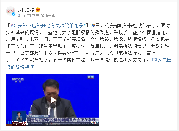26日,公安部副部长杜航伟表示,面对突如其来的疫情,一些地方为了阻断疫情传播渠道,采取了一些严格管理措施,出现了群众出不了门、下不了楼等现象,产生焦躁、焦虑、恐慌情绪。公安机关和有关部门在处理当中出现了过度执法、简单执法、粗暴执法的情况,针对这种情况,公安部及时下发文件要求整改,引导广大民警规范执法行为、言行。下一步,将坚持宽严相济,多一些柔性执法,多一些说理执法和人文关怀。