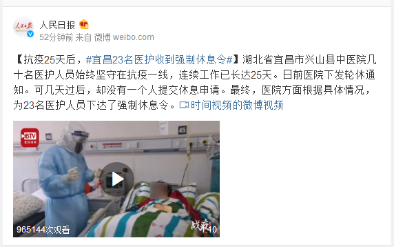 湖北省宜昌市兴山县中医院几十名医护人员始终坚守在抗疫一线,连续工作已长达25天。日前医院下发轮休通知。可几天过后,却没有一个人提交休息申请。最终,医院方面根据具体情况,为23名医护人员下达了强制休息令。