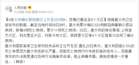 根据意大利卫生部发布的数据,截至当地时间26日0时,意大利累计确诊323例新冠病毒肺炎感染病例,新增4例死亡病例,累计11例死亡病例。25日,意大利的特伦蒂诺-上阿迪杰大区、利古里亚大区、托斯卡纳大区、西西里大区等4个大区皆首次出现了确诊病例。