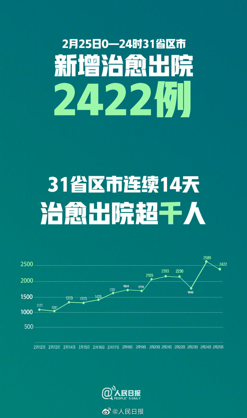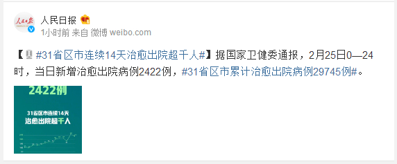 据国家卫健委通报,2月25日0—24时,当日新增治愈出院病例2422例,#31省区市累计治愈出院病例29745例#。