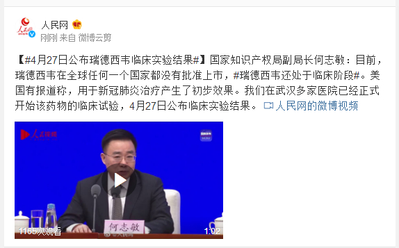 国家知识产权局副局长何志敏:目前,瑞德西韦在全球任何一个国家都没有批准上市,#瑞德西韦还处于临床阶段#。美国有报道称,用于新冠肺炎治疗产生了初步效果。我们在武汉多家医院已经正式开始该药物的临床试验,4月27日公布临床实验结果。