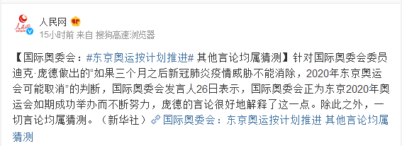 针对国际奥委会委员迪克·庞德做出的“如果三个月之后新冠肺炎疫情威胁不能消除,2020年东京奥运会可能取消”的判断,国际奥委会发言人26日表示,国际奥委会正为东京2020年奥运会如期成功举办而不断努力,庞德的言论很好地解释了这一点。除此之外,一切言论均属猜测。(新华社)