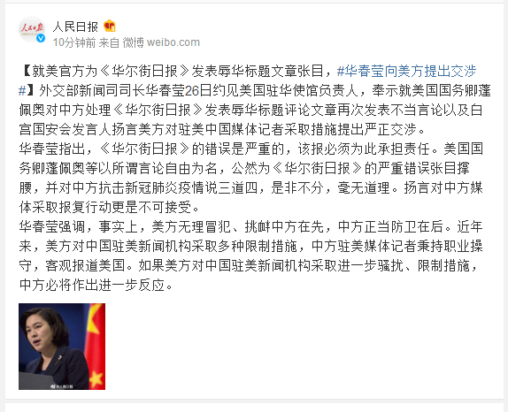 华春莹指出,《华尔街日报》的错误是严重的,该报必须为此承担责任。美国国务卿蓬佩奥等以所谓言论自由为名,公然为《华尔街日报》的严重错误张目撑腰,并对中方抗击新冠肺炎疫情说三道四,是非不分,毫无道理。扬言对中方媒体采取报复行动更是不可接受。