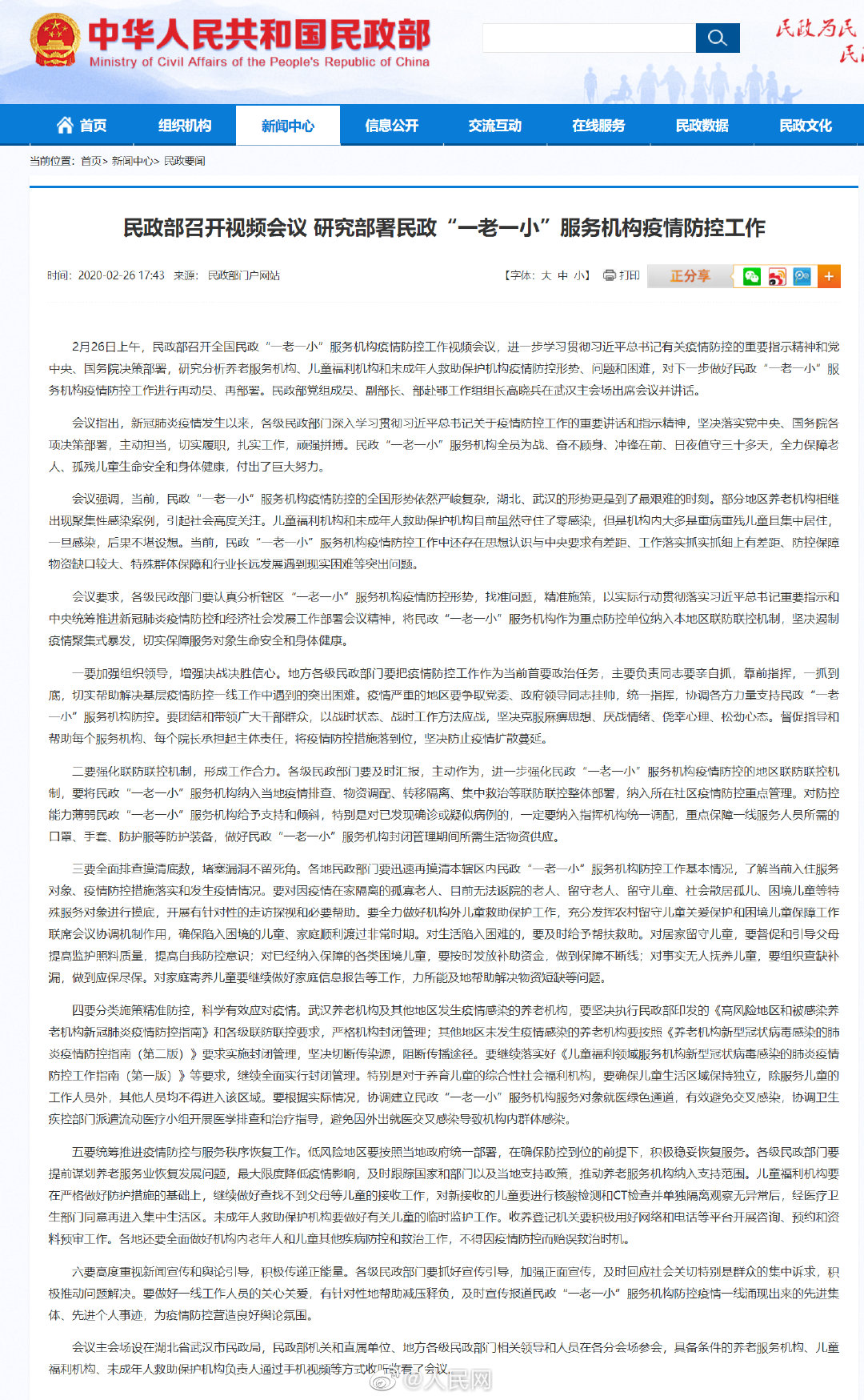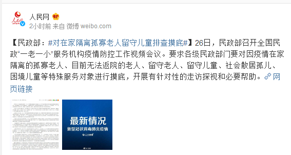 26日,民政部召开全国民政“一老一小”服务机构疫情防控工作视频会议。要求各级民政部门要对因疫情在家隔离的孤寡老人、目前无法返院的老人、留守老人、留守儿童、社会散居孤儿、困境儿童等特殊服务对象进行摸底,开展有针对性的走访探视和必要帮助。