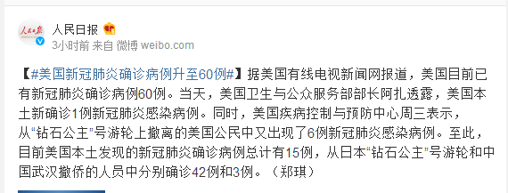据美国有线电视新闻网报道,美国目前已有新冠肺炎确诊病例60例。当天,美国卫生与公众服务部部长阿扎透露,美国本土新确诊1例新冠肺炎感染病例。同时,美国疾病控制与预防中心周三表示,从“钻石公主”号游轮上撤离的美国公民中又出现了6例新冠肺炎感染病例。至此,目前美国本土发现的新冠肺炎确诊病例总计有15例,从日本“钻石公主”号游轮和中国武汉撤侨的人员中分别确诊42例和3例。(郑琪)