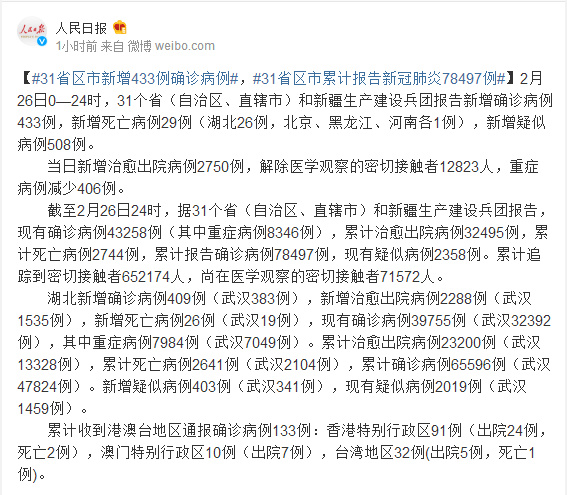 截至2月26日24时,据31个省(自治区、直辖市)和新疆生产建设兵团报告,现有确诊病例43258例(其中重症病例8346例),累计治愈出院病例32495例,累计死亡病例2744例,累计报告确诊病例78497例,现有疑似病例2358例。累计追踪到密切接触者652174人,尚在医学观察的密切接触者71572人。