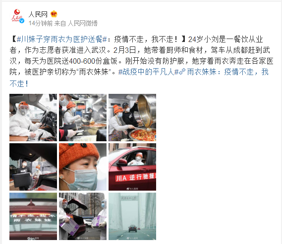 24岁小刘是一餐饮从业者,作为志愿者获准进入武汉。2月3日,她带着厨师和食材,驾车从成都赶到武汉,每天为医院送400-600份盒饭。刚开始没有防护服,她穿着雨衣奔走在各家医院,被医护亲切称为“雨衣妹妹”。