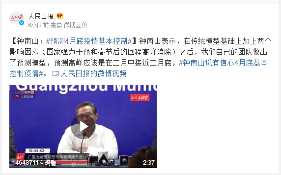 钟南山表示,在传统模型基础上加上两个影响因素(国家强力干预和春节后的回程高峰消除)之后,我们自己的团队做出了预测模型,预测高峰应该是在二月中接近二月底,#钟南山说有信心4月底基本控制疫情#。