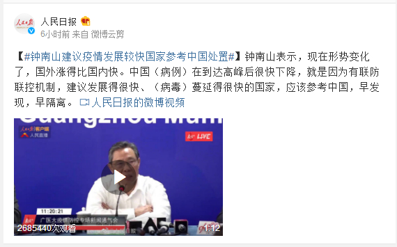 钟南山表示,现在形势变化了,国外涨得比国内快。中国(病例)在到达高峰后很快下降,就是因为有联防联控机制,建议发展得很快、(病毒)蔓延得很快的国家,应该参考中国,早发现,早隔离。