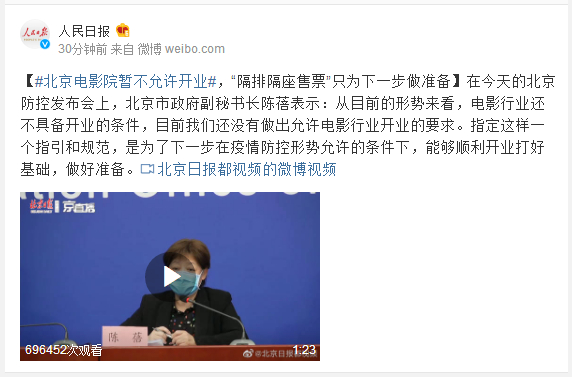 在今天的北京防控发布会上,北京市政府副秘书长陈蓓表示:从目前的形势来看,电影行业还不具备开业的条件,目前我们还没有做出允许电影行业开业的要求。指定这样一个指引和规范,是为了下一步在疫情防控形势允许的条件下,能够顺利开业打好基础,做好准备。