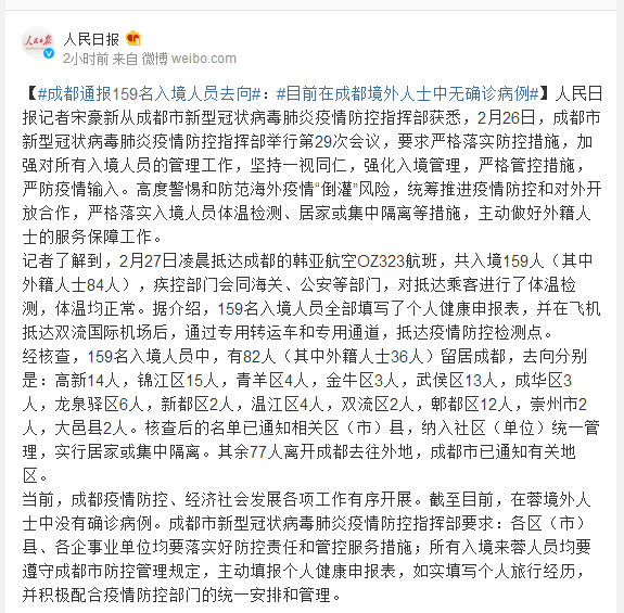 人民日报记者宋豪新从成都市新型冠状病毒肺炎疫情防控指挥部获悉,2月26日,成都市新型冠状病毒肺炎疫情防控指挥部举行第29次会议,要求严格落实防控措施,加强对所有入境人员的管理工作,坚持一视同仁,强化入境管理,严格管控措施,严防疫情输入。高度警惕和防范海外疫情“倒灌”风险,统筹推进疫情防控和对外开放合作,严格落实入境人员体温检测、居家或集中隔离等措施,主动做好外籍人士的服务保障工作。