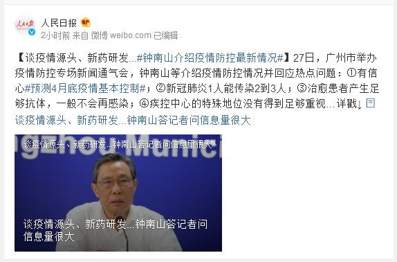27日,广州市举办疫情防控专场新闻通气会,钟南山等介绍疫情防控情况并回应热点问题:①有信心#预测4月底疫情基本控制#;②新冠肺炎1人能传染2到3人;③治愈患者产生足够抗体,一般不会再感染;④疾控中心的特殊地位没有得到足够重视…