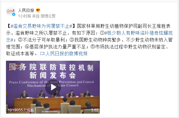 国家林草局野生动植物保护司副司长王维胜表示,滥食野味之所以屡禁不止,有如下原因:①#极少数人有野味滋补猎奇炫耀观念#;②不法分子可牟取暴利;③我国野生动物种类繁多,不少野生动物未纳入管理范围;④基层保护执法力量严重不足;⑤市场执法过程中野生动物识别鉴定、取证成本高等。