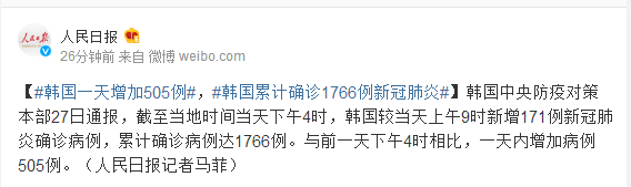韩国中央防疫对策本部27日通报,截至当地时间当天下午4时,韩国较当天上午9时新增171例新冠肺炎确诊病例,累计确诊病例达1766例。与前一天下午4时相比,一天内增加病例505例。(人民日报记者马菲)